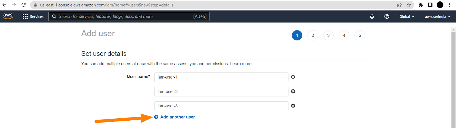 Click on Add users, Then you will see 5 step process to create IAM user