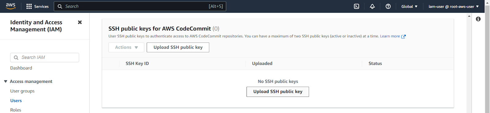 Step 11 – SSH public keys for AWS CodeCommit (0) : Here we need to upload the SSH Public key
